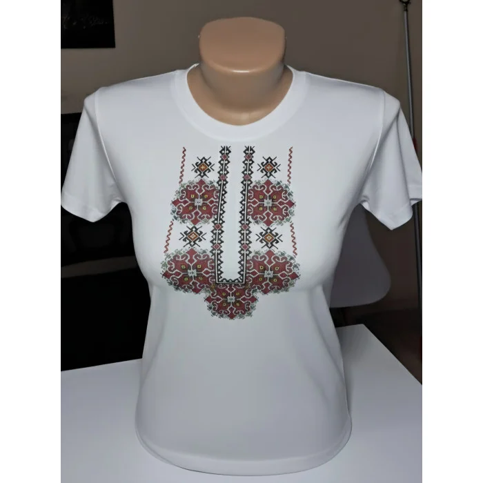 Стильна футболка з автентичним принтом — ідеальний вибір для тих, хто цінує етнічні мотиви в сучасному виконанні. Дизайн імітує традиційну українську вишивку (вишиванку), що робить образ урочистим і водночас практичним для щоденного носіння.